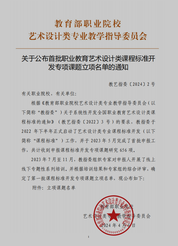 据悉,根据《教育部职业院校艺术设计类专业教学指导委员会关于系统性开发全国职业教育艺术设计类课程标准的通知》(教艺指委[2022]3号)的要求,教指委于2022 年下半年正式启动了艺术设计类专业课程标准开发工作,并于2023年5月完成了首批申报工作,共计收到申报课程标准开发专项课题研究 656 项。