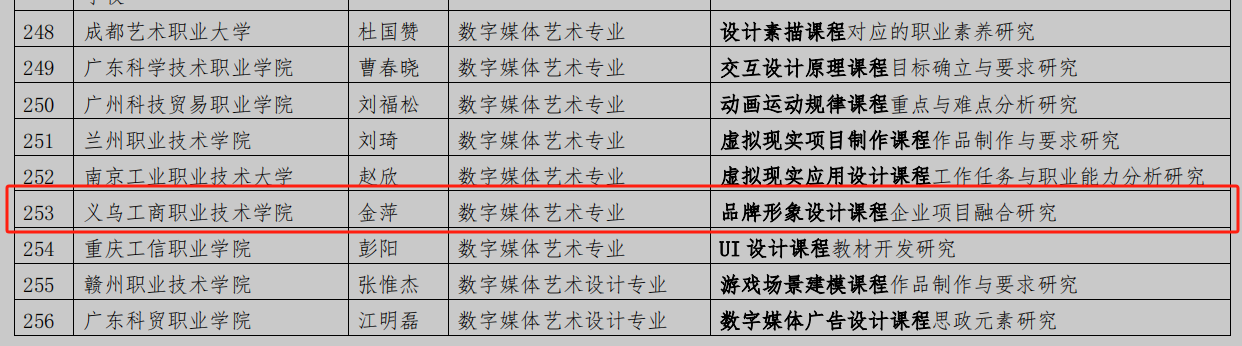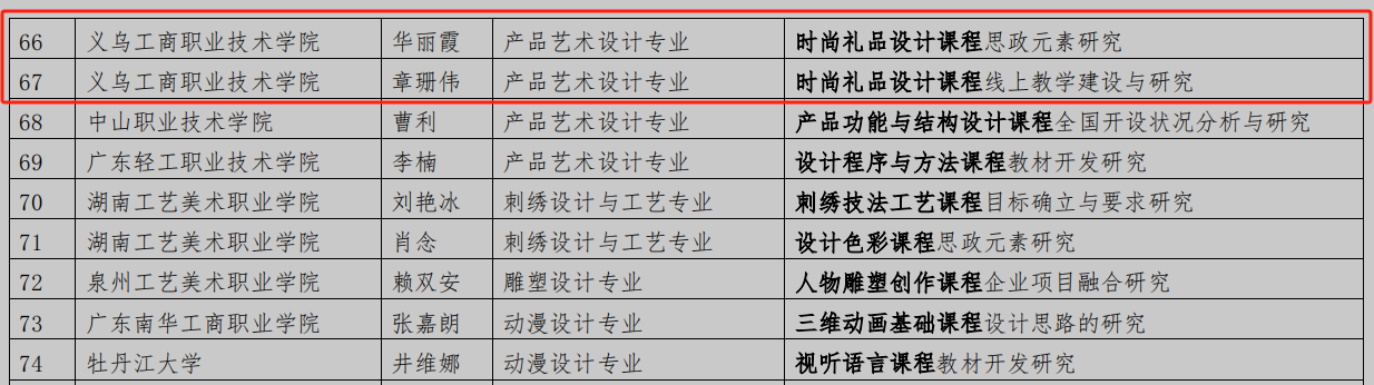 近日,教育部职业院校艺术设计类专业教学指导委员会公布了首批职业教育艺术设计类课程标准开发专项课题具体名单。万象城官网教师华丽霞主持的《时尚礼品设计课程思政元素研究》、金萍主持的《品牌形象设计课程企业项目融合研究》、章珊伟主持的《时尚礼品设计课程线上教学建设与研究》课题,均经过严格评审,成功获批立项。