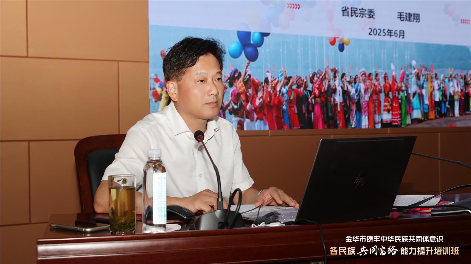 开班仪式后,毛建翔作了题为《铸牢中华民族共同体意识在浙江的理论和实践》的专题讲座。据悉,本次培训为期4天,构建了“专题研学—现场体悟—互学互鉴”三位一体教学链条,将邀请华东理工大学等专家解读铸牢中华民族共同体意识的理论根基,携手艺术与设计领域教授剖析中华优秀传统文化创造性转化路径,联合实战经验丰富的创业导师分享数字赋能文旅融合、品牌培育提升策略。在实践环节上,特别设置义乌国际陆港电商城、国际商贸城直播基地等内容,确保理论高度与实践深度有机统一。