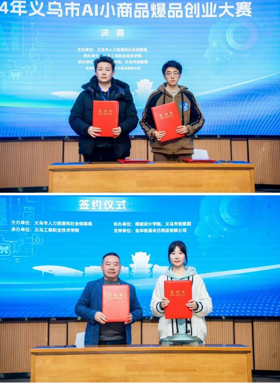 本次大赛分为初赛、复赛、决赛三个阶段,大赛征集得到了社会各界的广泛关注和支持,初赛共收到235个创业项目,经过初赛和复赛的专家组遴选,有18个项目进入大赛的最终决赛现场。决赛采用“3+2”互动答辩模式(3分钟作品宣讲/展示+2分钟专家问答)。选手以演示文档与视频相结合的形式向评委表达项目设计的理念、创业计划及项目亮点等,再由专家对项目进行评估并现场评分。决赛展示了参赛选手利用AIGC(人工智能生成内容)技术进行创业的模式和理念,展现了选手的精彩表现。路演结束后,“义乌文创冰箱贴”和“AI智能健康监测镜”两个项目受到了义乌福韵科技有限公司和义乌桃溪米新材料有限公司的青睐,进行了现场的项目落地签约。签约仪式后,现场揭晓了本次大赛的获奖名单,并由现场的嘉宾和领导进行了隆重的颁奖。