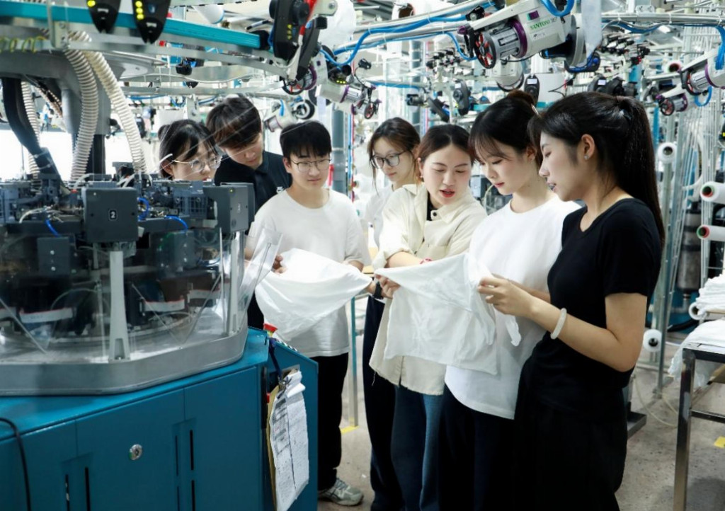 校企合作产教融合企业是创新的源泉。天派针织股份有限公司和浙江聚衣堂服饰有限公司是学校紧密合作的两家产教融合示范企业。其中,天派针织是国际无缝针织内衣龙头企业,智能制造规模和工业物联网技术水平全球领先。聚衣堂服饰是国内瑜伽服供应链第一品牌,是国家级瑜伽服智能制造示范企业。头部企业快速成长带来的需求是高校人才培养和教学科研的发展动力。近日,学生团队将研发产品带到企业现场,验证产品在车间生产样衣的应用效果,实验取得了预期的成果,功能性纱线和人工智能技术受到企业研发部门的高度肯定。