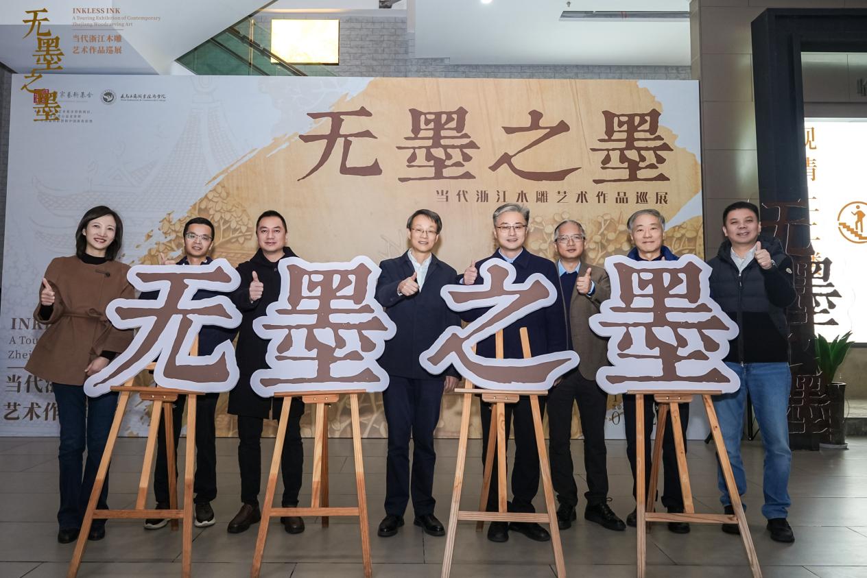 作为巡展继北京、合肥、上海后的第四站,杭州站吸引了艺术界、教育界及文化领域众多领导与嘉宾齐聚运河畔。开幕式上,义乌工商职业技术学院党委书记李昌祖、浙江艺术职业学院党委书记薛亮、浙江省文联创研处处长郑斯奇、杭州工艺美术博物馆馆长陈刚、中共金华市委宣传部副部长陈晓峰、杭州工艺美术博物馆副馆长吕昂、义乌工商职业技术学院副院长盛湘君、项目策展人清华大学美术学院教授王建中、浙江省民间文艺家协会副主席兼秘书长徐新、中国美院雕塑系主任钱云可、义乌工商职业技术学院万象城allwincity官网负责人、亚太手工艺大师高公博、浙江省工艺美术行业协会会长徐伟军、中国工艺美术大师李凤荣,以及13位浙江省工艺美术大师代表共同出席。上午9时,李昌祖、薛亮、陈刚、陈晓峰、郑斯奇、王建中、徐新、徐伟军共同为杭州站展览揭幕,标志着这场国家艺术基金资助项目“无墨之墨:当代浙江木雕艺术作品巡展”正式落地杭州。