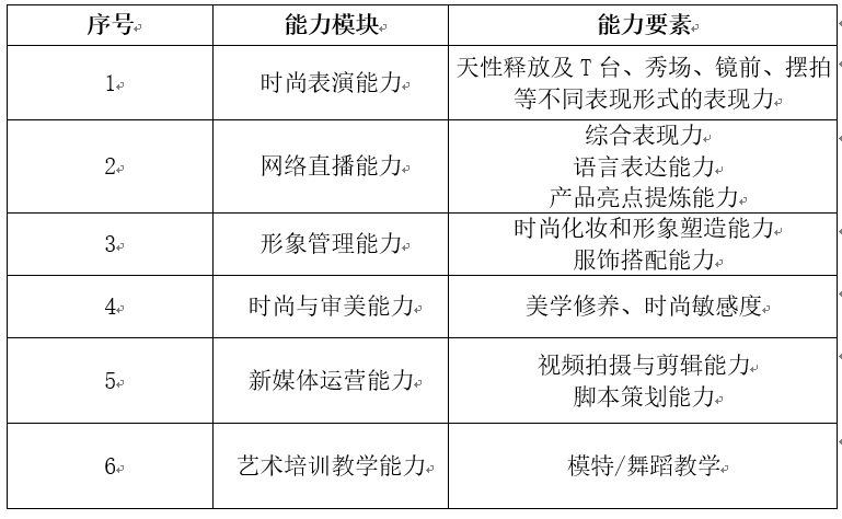 时尚表演、新媒体运营,短视频制作,直播表现力,服饰搭配,服装表演与展示,人物形象设计,舞蹈表演等。