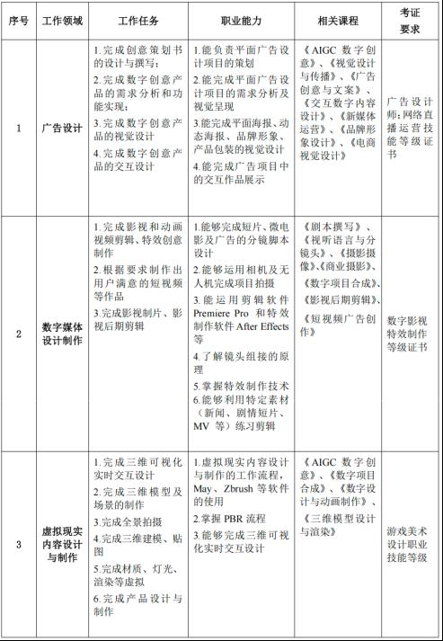 电商视觉设计、新媒体运营、品牌形象设计、数字设计与动画制作、三维模型设计与渲染、交互数字内容设计、影视后期剪辑、短视频广告创作等。
