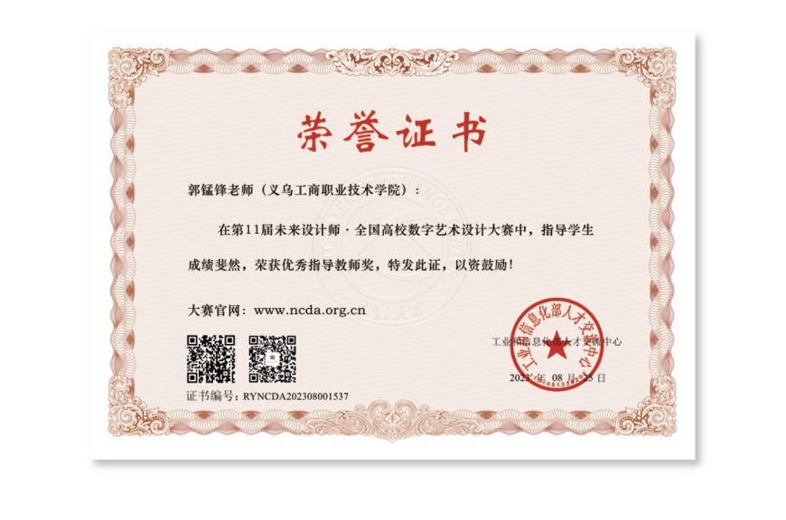 近日,2023年“第十一届未来设计师·全国高校数字艺术设计大赛(NCDA)”全国总决赛成绩正式揭晓,万象城官网在全国总决赛中再获佳绩,共获国赛一等奖1项、二等奖1项、三等奖1项。